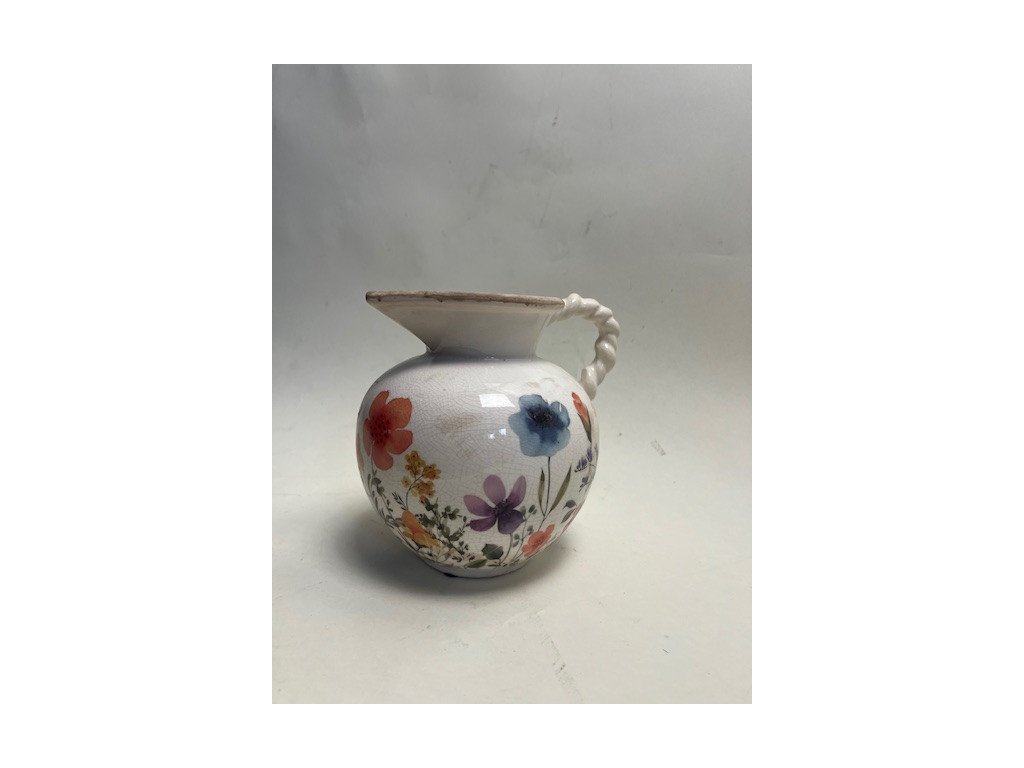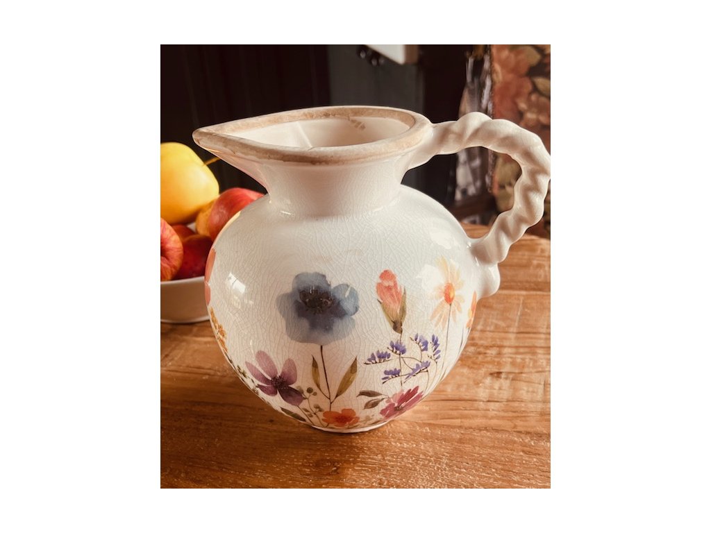 Rustikální džbánek na vodu s patinou a zpevněným uchem. Krásné nenápadné a barevné květy a tvar připomínají kameninu našich babiček.
