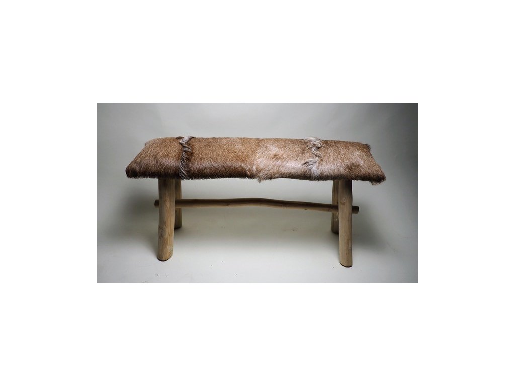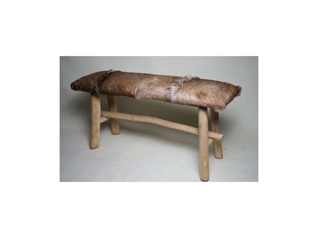 Rozměr: 100x30, výška 48 cm, teakové dřevo, kulatina v přírodním provedení /nemořeno a kozí kožešina v různých barevných provedeních.