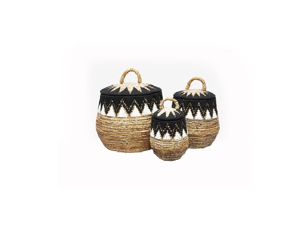 NOVINKA: prádelní koše tří velikostí, kombinace vodní trávy a bohatých ornamentů. Spíše africká kultura. Barvy černá s bílou.