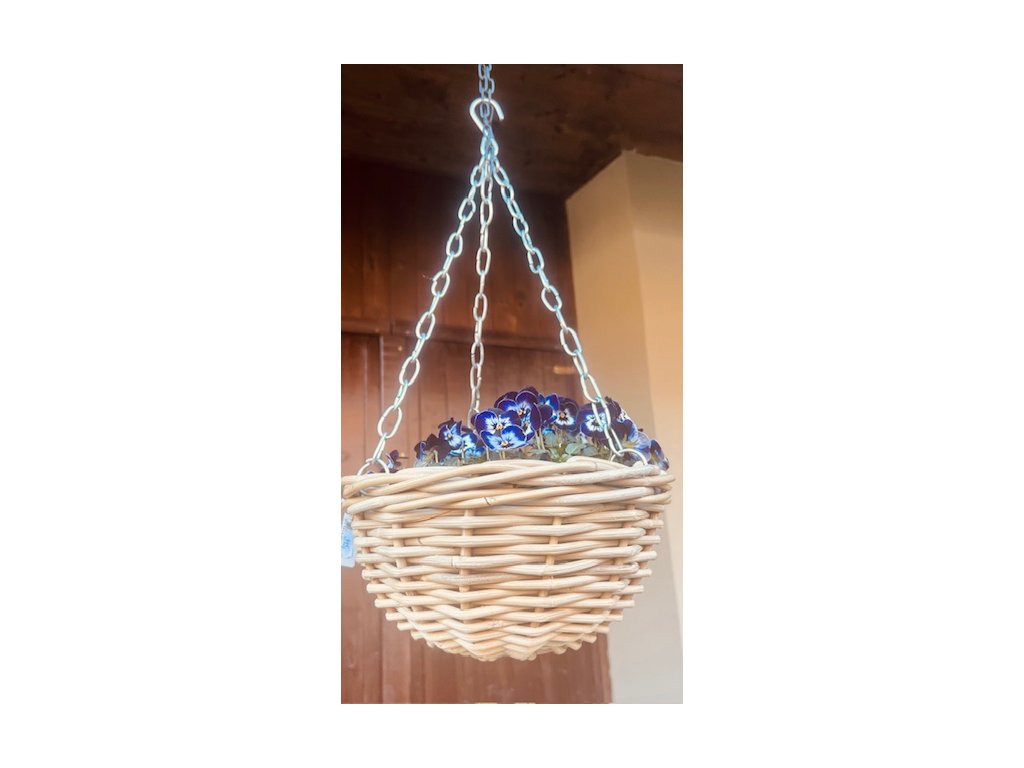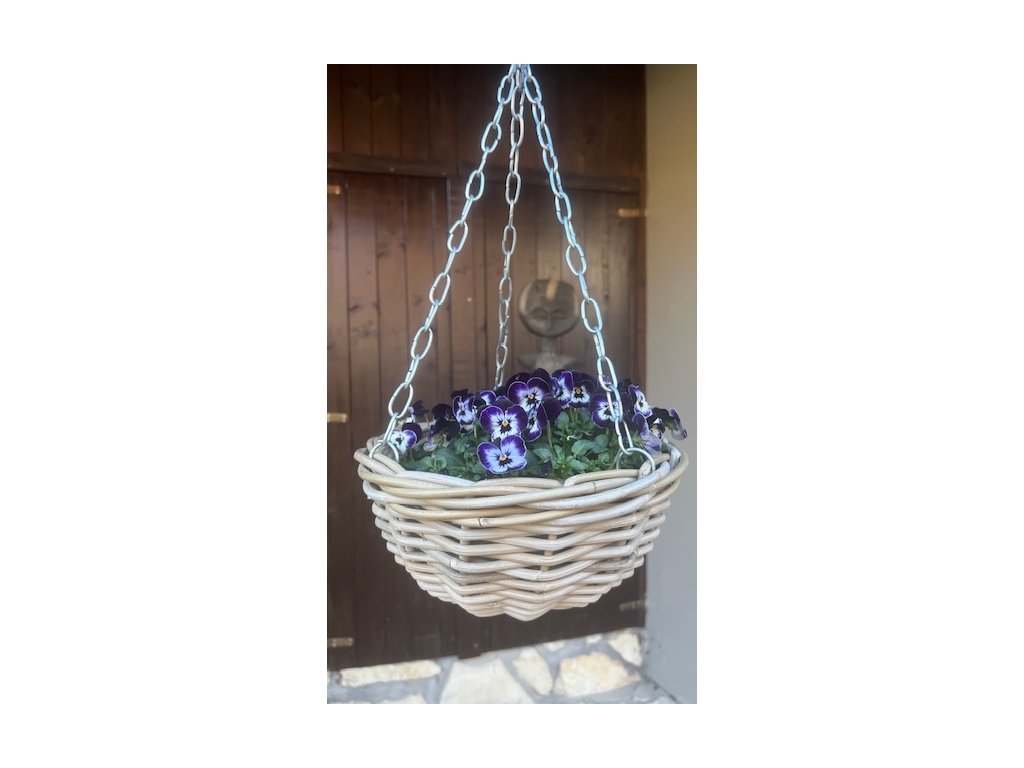 Závěsný obal vč. vnitřního plastu ve tvaru ošatky, z plných prutů z šedého- kubu- ratanu. Řetízek je upevněn na kovových okách, které jsou upevněny v pletení koše.