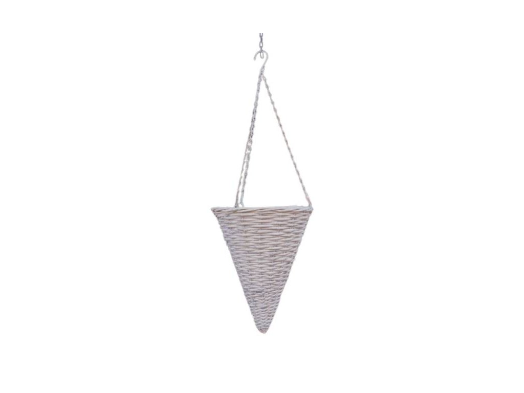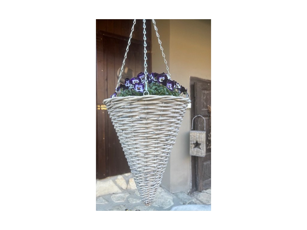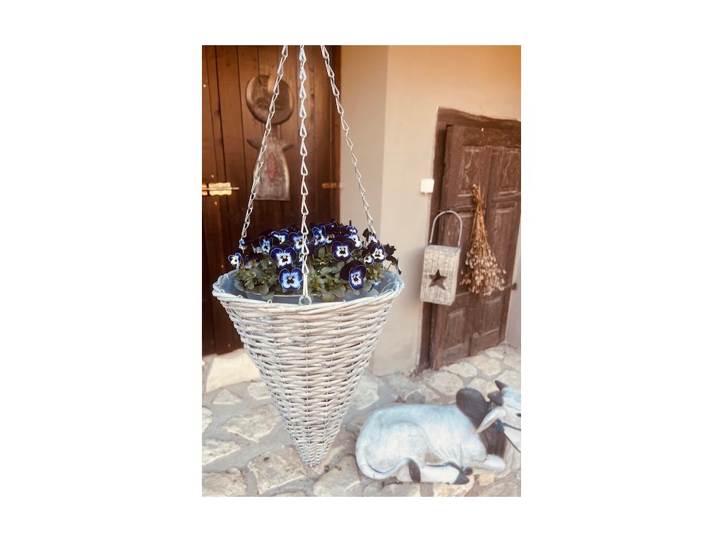 Závěsné ratanové květináče s jemnou patinou do šeda v nezvyklém tvaru kapky. Uvnitř igelitový kryt. Závěs na řetízku upevněném na kovových okách . Konstrukce kovový drát a na něm je napleten ratanový prut.