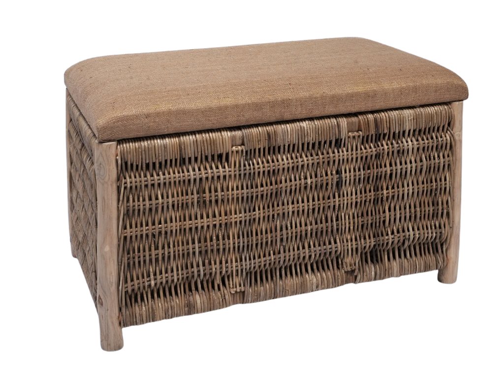 Rozměr: délka 90cm, výška 53cm, hloubka 50cm. Materiál šedý ratan, pevné celé pruty. Možnost přečalounění vrchní části na vámi zvolenou látku možná na naší dílně i dle výběru látek v sekci bytové doplňky nebo gobelínové látky.