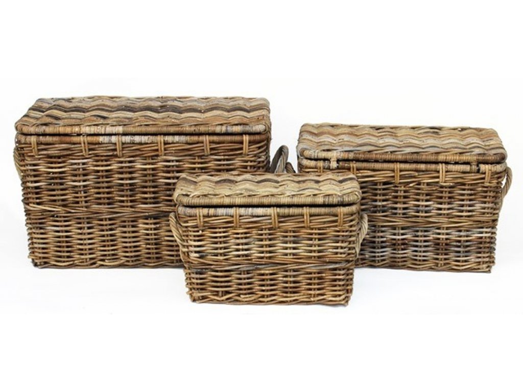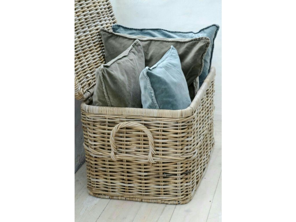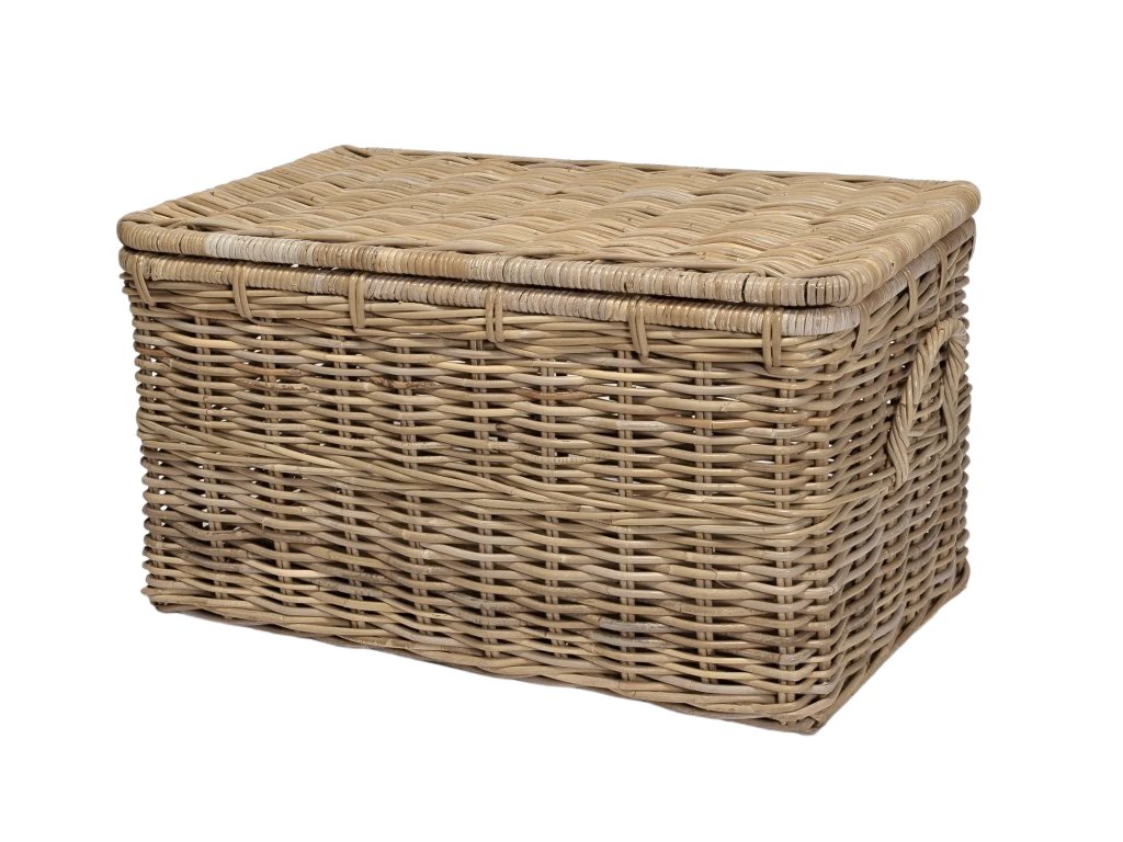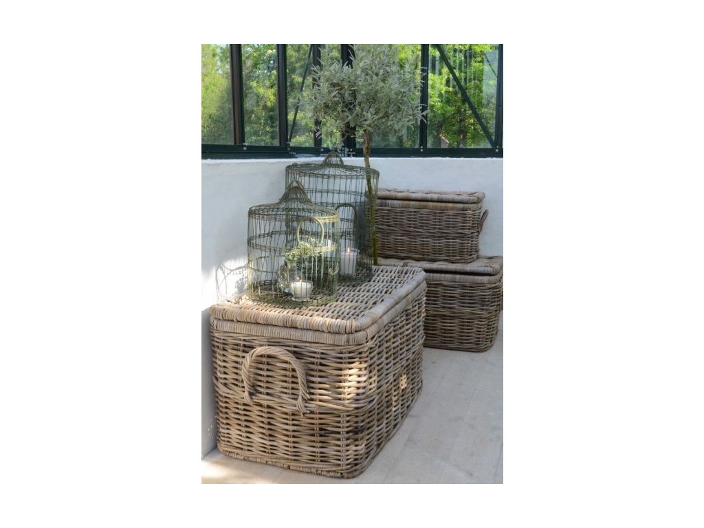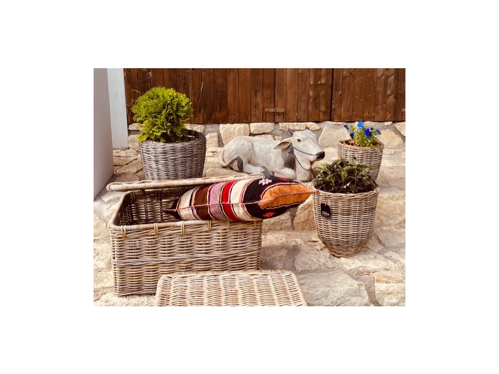 Rozměr: 75x45 cm, výška 42 cm, šedý kubu ratan-nepůlený, vrchní rám kov, možno našít povlak do truhly dle nabídky látek. Na koši jsou napletena velká ucha.